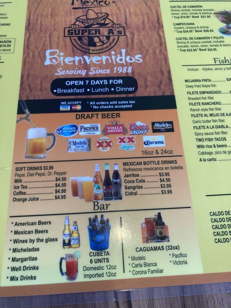 Welcome to Super A's Mexican Food, a gem nestled at 2949 Fairview Rd, Costa Mesa. This vibrant eatery offers a delightful array of authentic Mexican dishes, perfect for any meal of the day. From breakfast to dinner, the menu features mouthwatering options like succulent carne asada plates and flavorful soft tacos, including the highly recommended barbacoa. Notably, their Menudo is a weekend highlight, prepared with care over several days for maximum flavor.